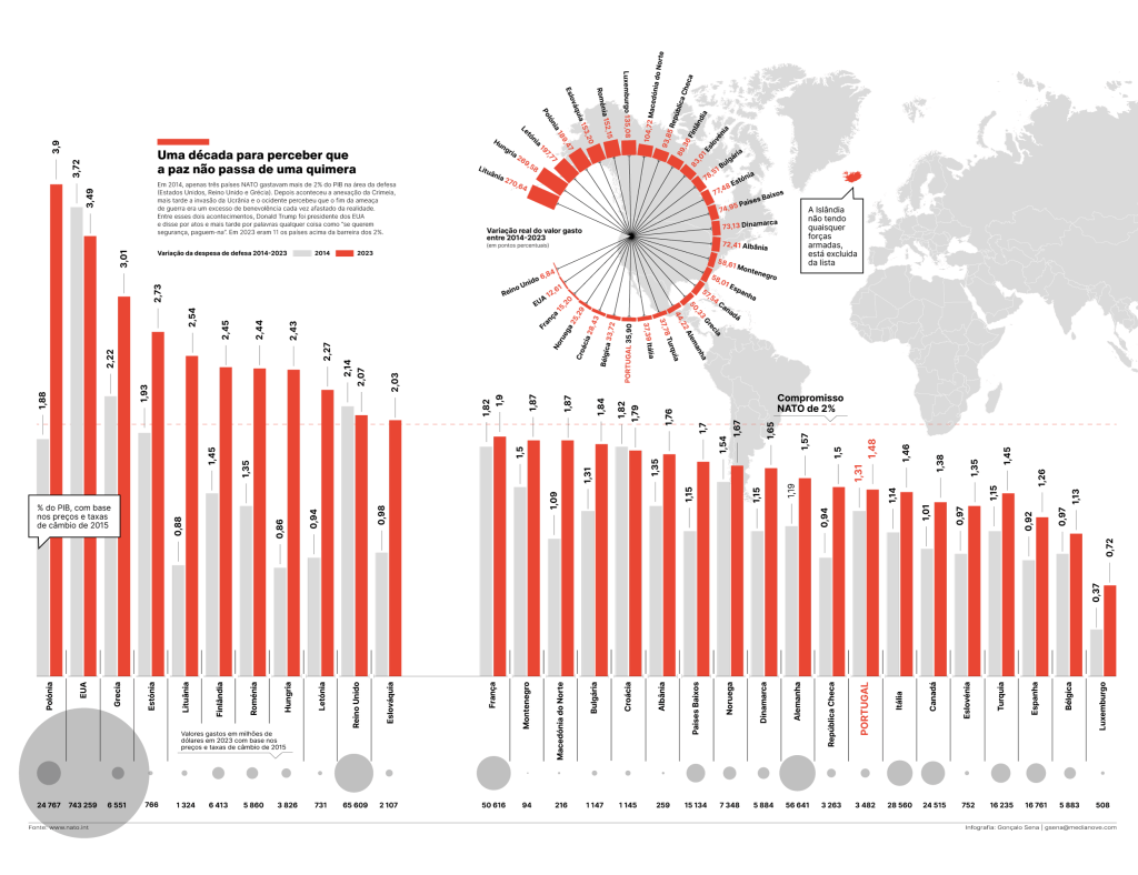Além disto, apesar dos (não) desenvolvimentos no conflito, tem existido uma pressão crescente da NATO para que os estados membros da Aliança reforcem o investimento em defesa para pelo menos 2% do PIB, meta atingida por menos de metade dos aliados e onde Portugal surge ainda com um investimento inferior a 1,5%.