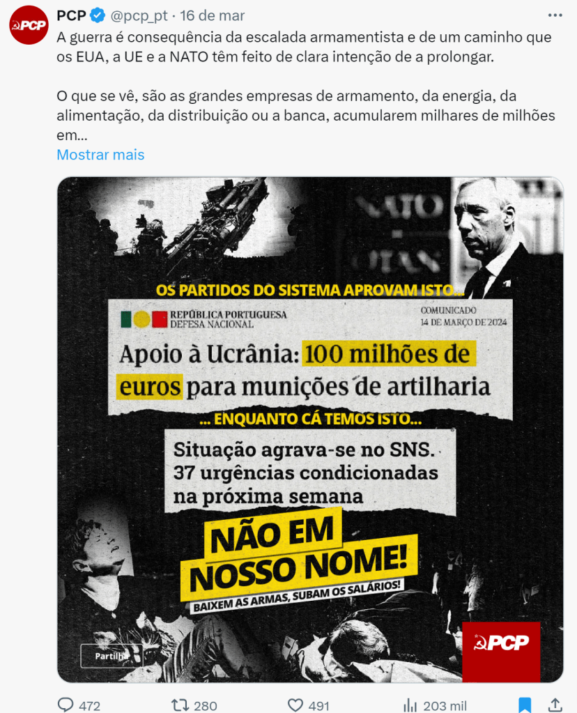Estar numa economia de guerra significa empobrecer, reduzir apoios sociais e ampliar sentimentos de injustiça, algo que só pode beneficiar partidos como os que de forma consistente rejeitam estas opções. Se esse momento chegar o PCP não estará sozinho, serão seguramente mais aqueles que por oportunismo ou por convicção concordarão com a posição comunista.