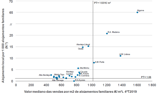 Figura 2 – Alojamento local por 1000 alojamentos familiares clássicos (parque habitacional) e valor mediano das vendas por m2 de alojamentos familiares, Portugal e NUTS, 4ºT 2019