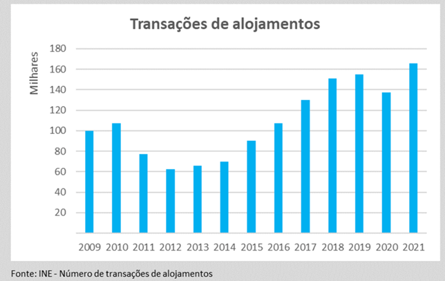 A análise dos dados disponibilizados pelo INE relativos à evolução do número total de compra e venda de casas, permite perceber que desde 2016 se transacionam mais de 100.000 habitações por ano, tendo sido atingido o recorde de 160.000 casas em 2021. São volumes de transações 60% superiores ao ocorrido em 2009 antes da crise (figura 3).