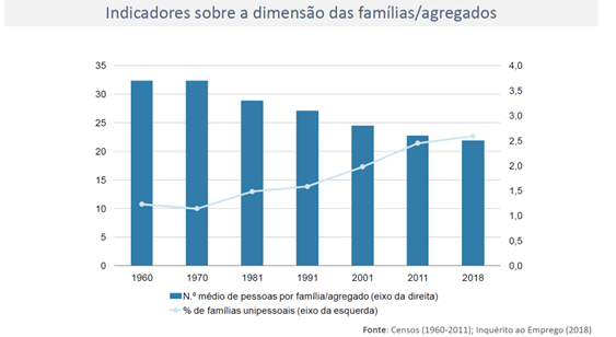 Recorrendo aos dados do INE podemos perceber que o número médio de pessoas por agregado familiar tem vindo a reduzir-se de forma muito significativa ao longo dos últimos anos e a percentagem de famílias unipessoais atingiu em 2018 um patamar superior a 20%. (figura 4), fazendo de Portugal o país da União Europeia com menor número médio de habitantes por fogo habitacional (1,8).